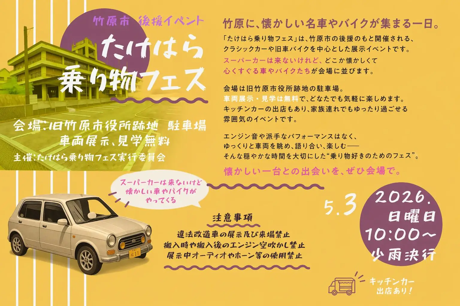 たけはら乗り物フェス エリア: 中心部(町並み保存地区ほか) 開催日:2026年5月3日(日) ※少雨決行 No translations[8] for 季節・キーワード: 春 竹原市街地 マイプランに追加