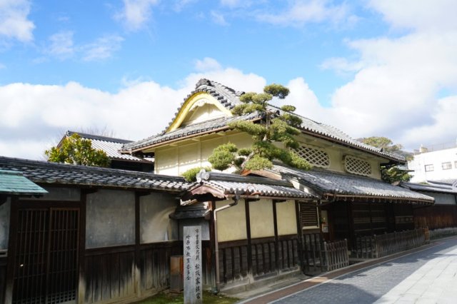 ハートの格子を探してみて!町並み保存地区内にある代表的な商家のひとつ。唐破風の屋根や庇、出格子など華やかで堂々とした意匠が特徴。