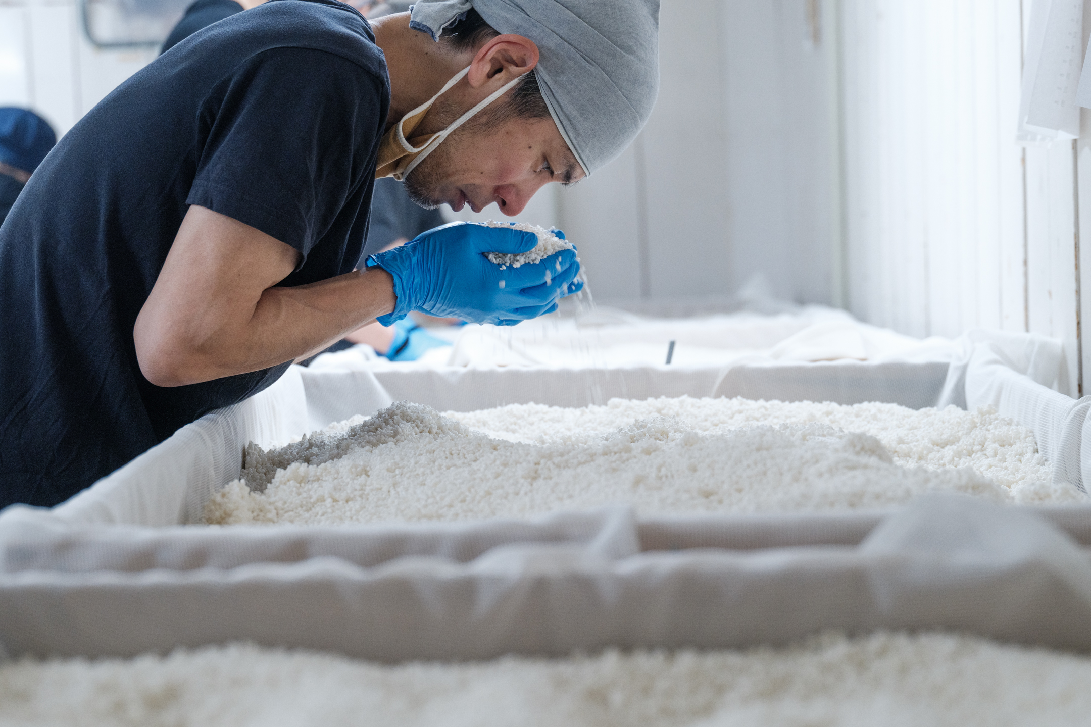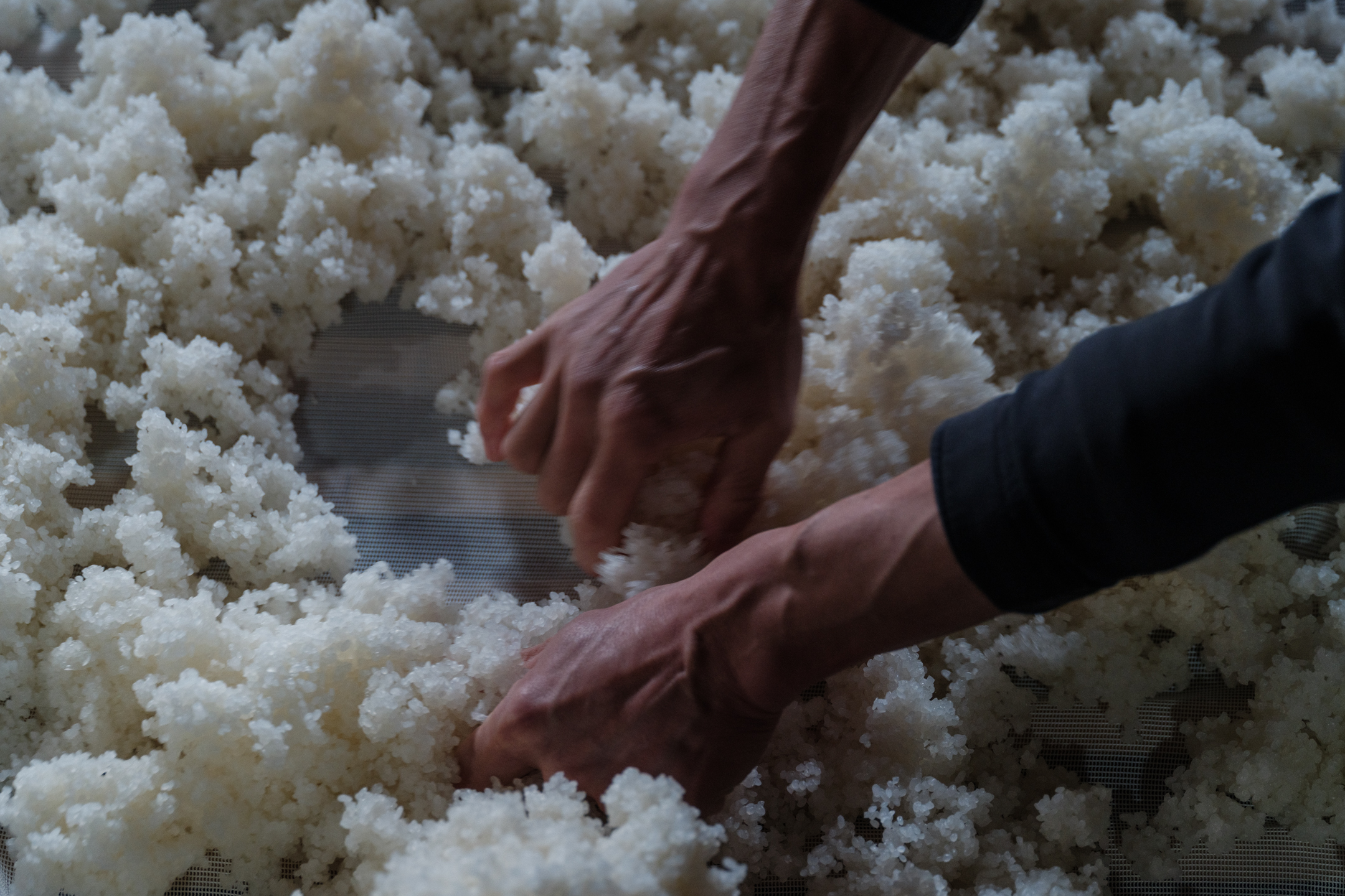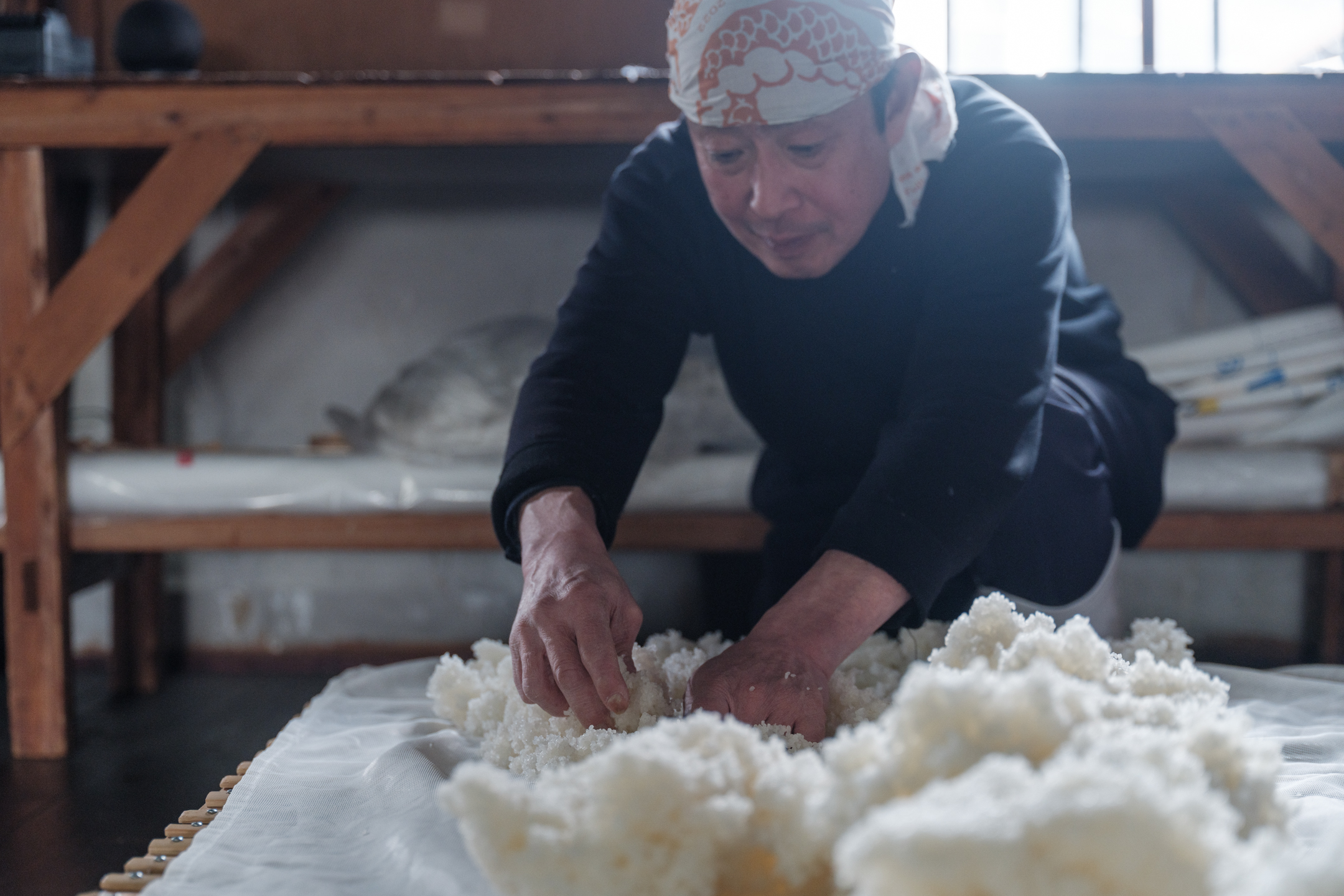 In the koji room, a gentle sweetness like freshly steamed chestnuts hangs in the air. “At Fujii Shuzo, we use plenty of koji mold,” says Toji Okada. He catches subtle changes in the koji, finely adjusting the temperature as if searching for the breathing of a living creature. Originally a teacher in Shimane, Okada’s love for sake led him to switch to the world of Japanese sake at age 25, and he has been honing his skills at Fujii Shuzo for about 10 years. 2023, the year Okada became Toji, was also a turning point when the brewery unified all its sake production under the traditional Kimoto method.