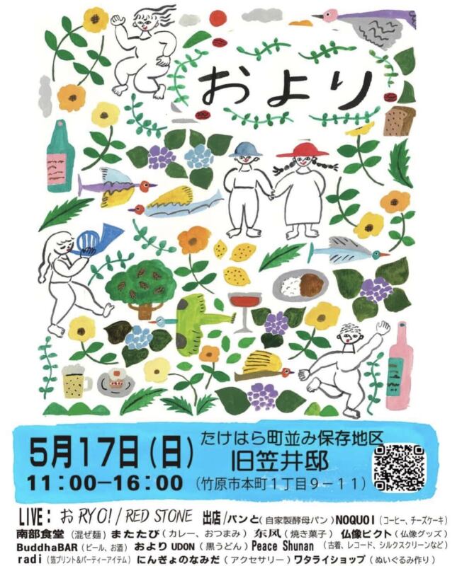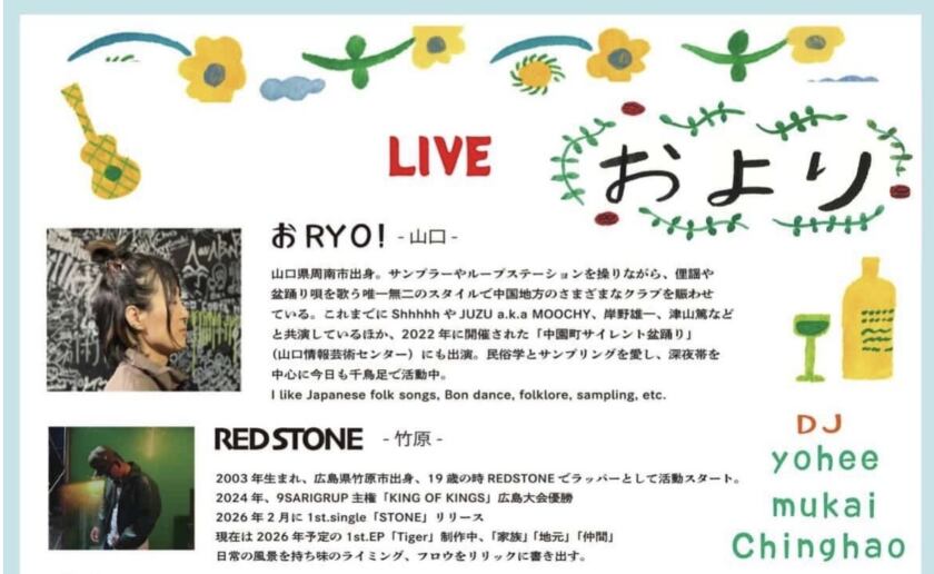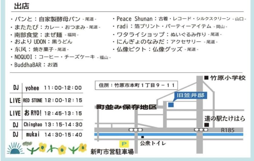 地域内外から個性豊かなアーティストやショップが集まり、ライブやDJによる音楽とともに、こだわりのフードや雑貨を楽しめる1日限定のイベント。竹原ならではのローカルカルチャーを体感できる特別な空間が広がります。