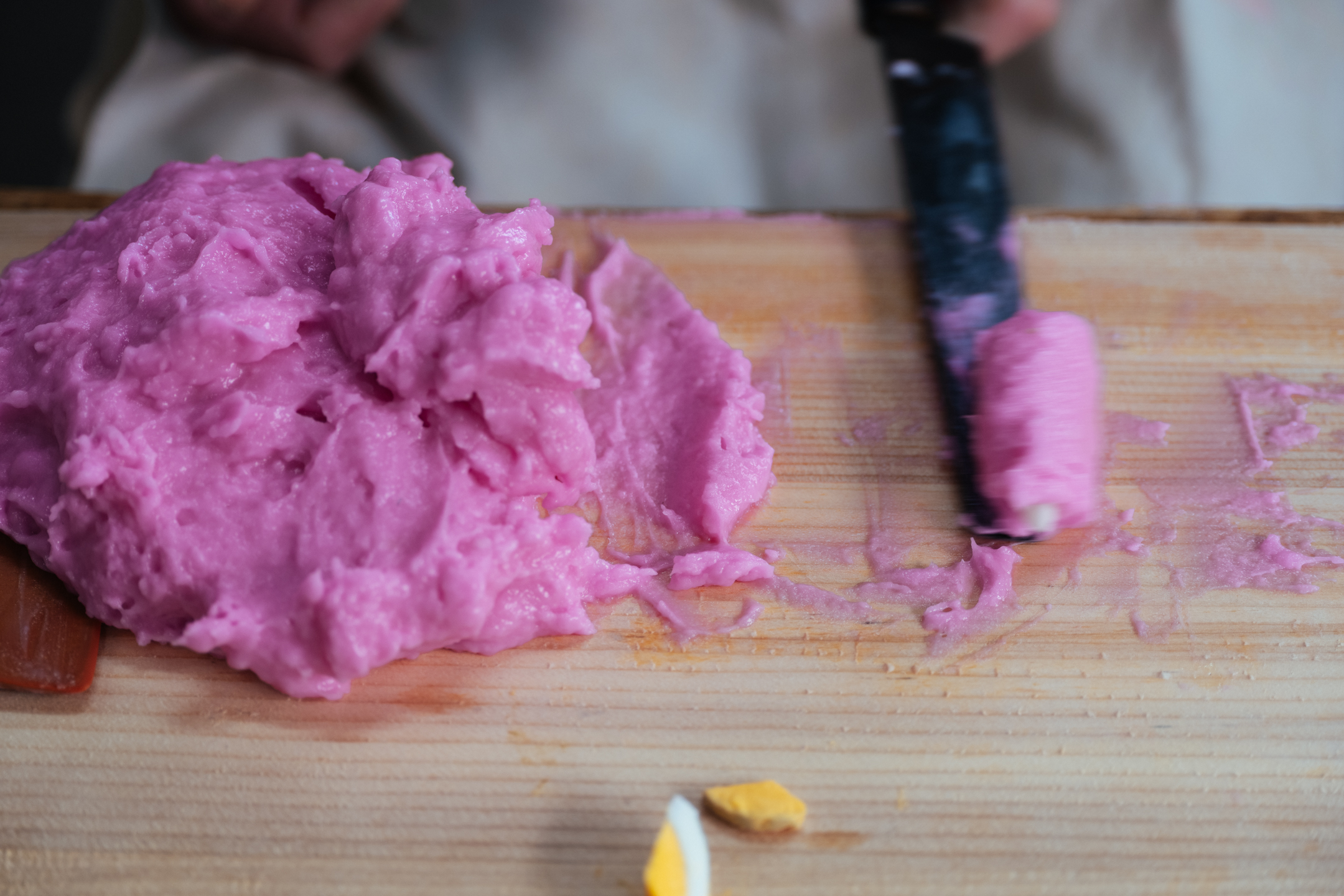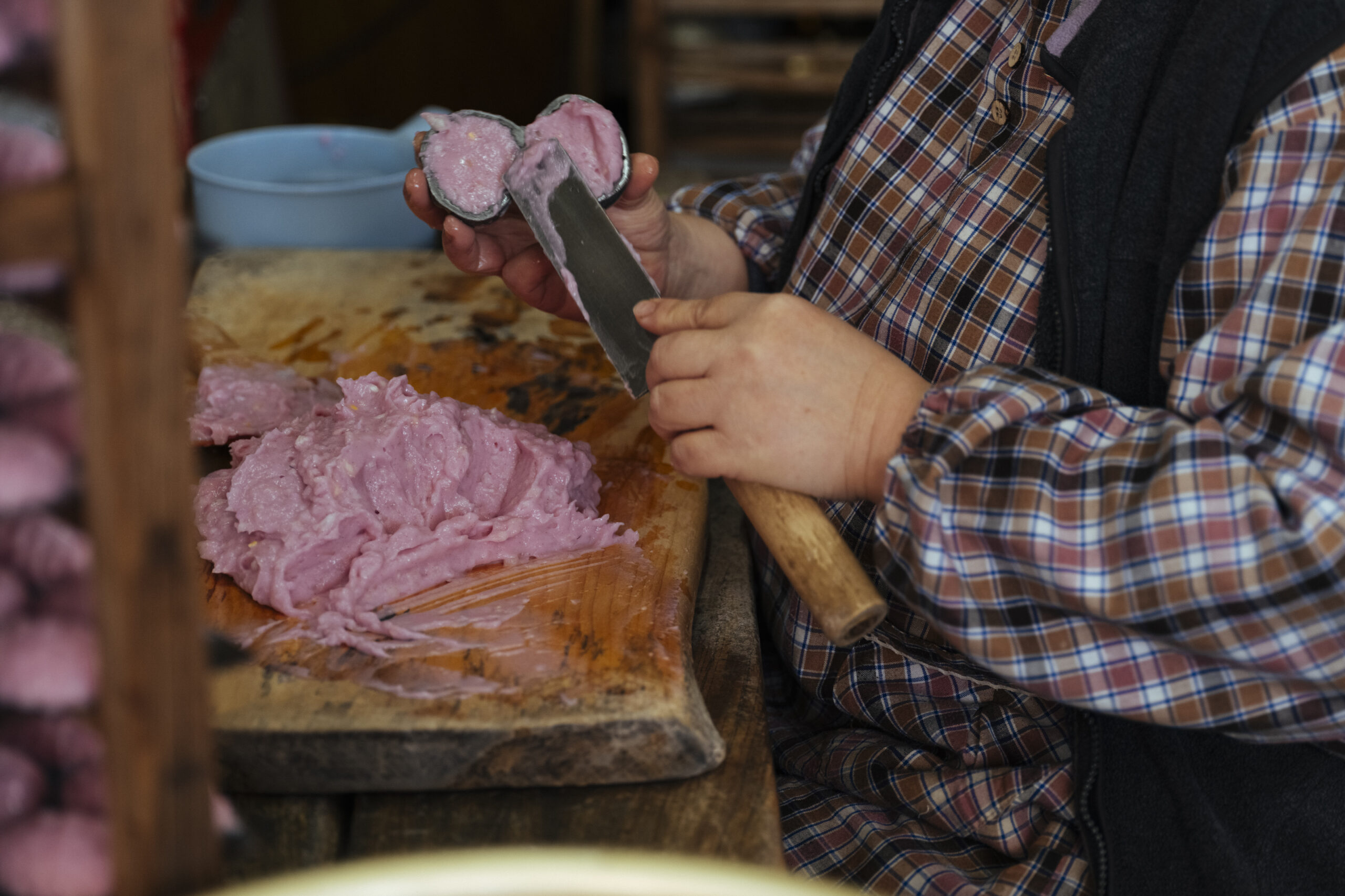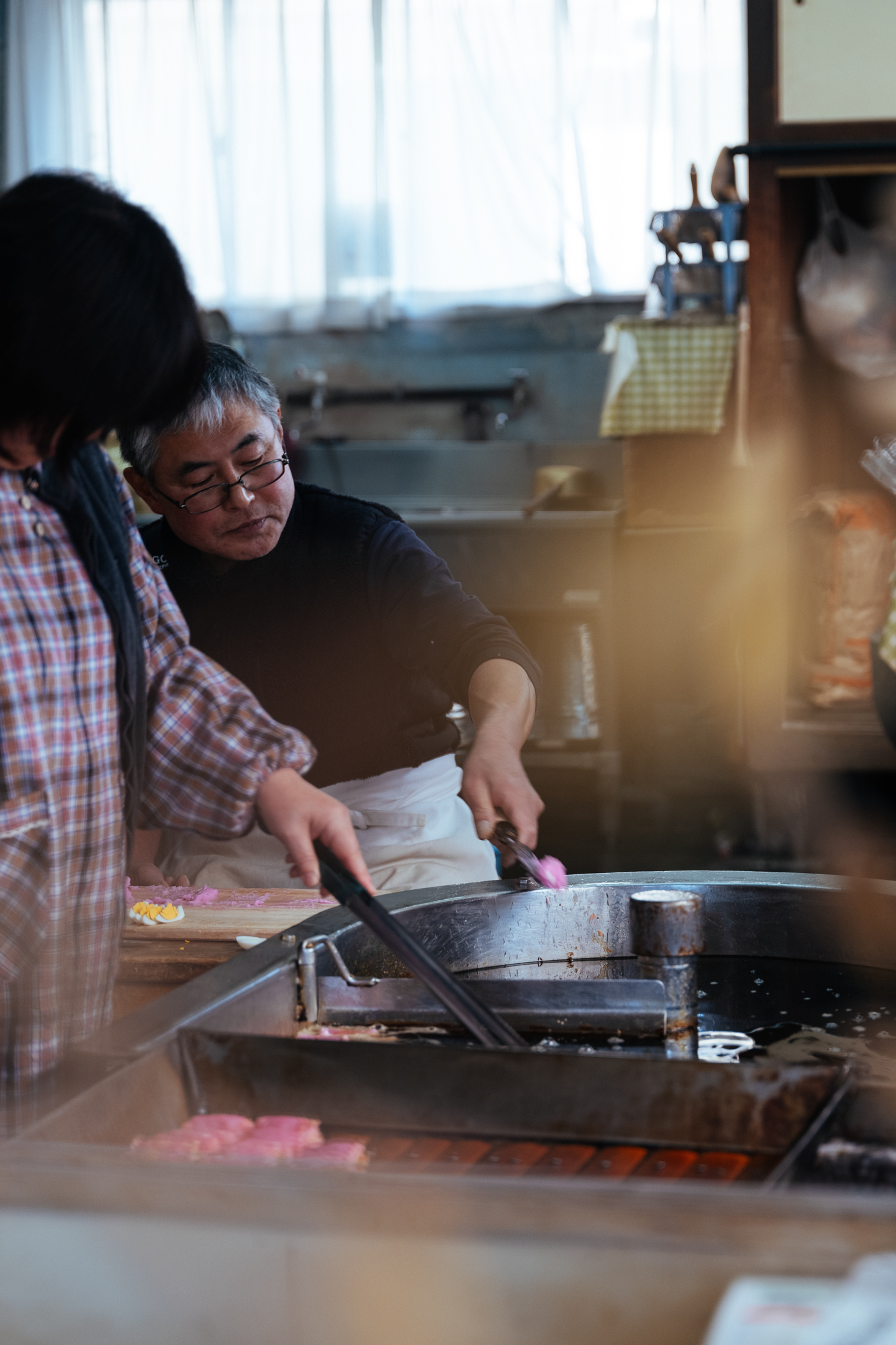 이날 만들고 있던 것은 ‘타마고텐(계란 튀김)’. 자른 삶은 계란을 선명한 분홍빛 어육 반죽으로 감쌉니다. 반죽을 펴는 마사츠구 씨의 솜씨가 무척 능숙합니다. 저울도 쓰지 않고 일정량을 도마에 펴서 계란을 감싸고 기름에 넣는 과정을 반복합니다. 몸이 기억하는 리듬에 맞춰 차례차례 튀겨냅니다. 기름 속에서 보글보글 춤추는 어묵은 아내인 요시미 씨가 적당한 때에 건져냅니다.