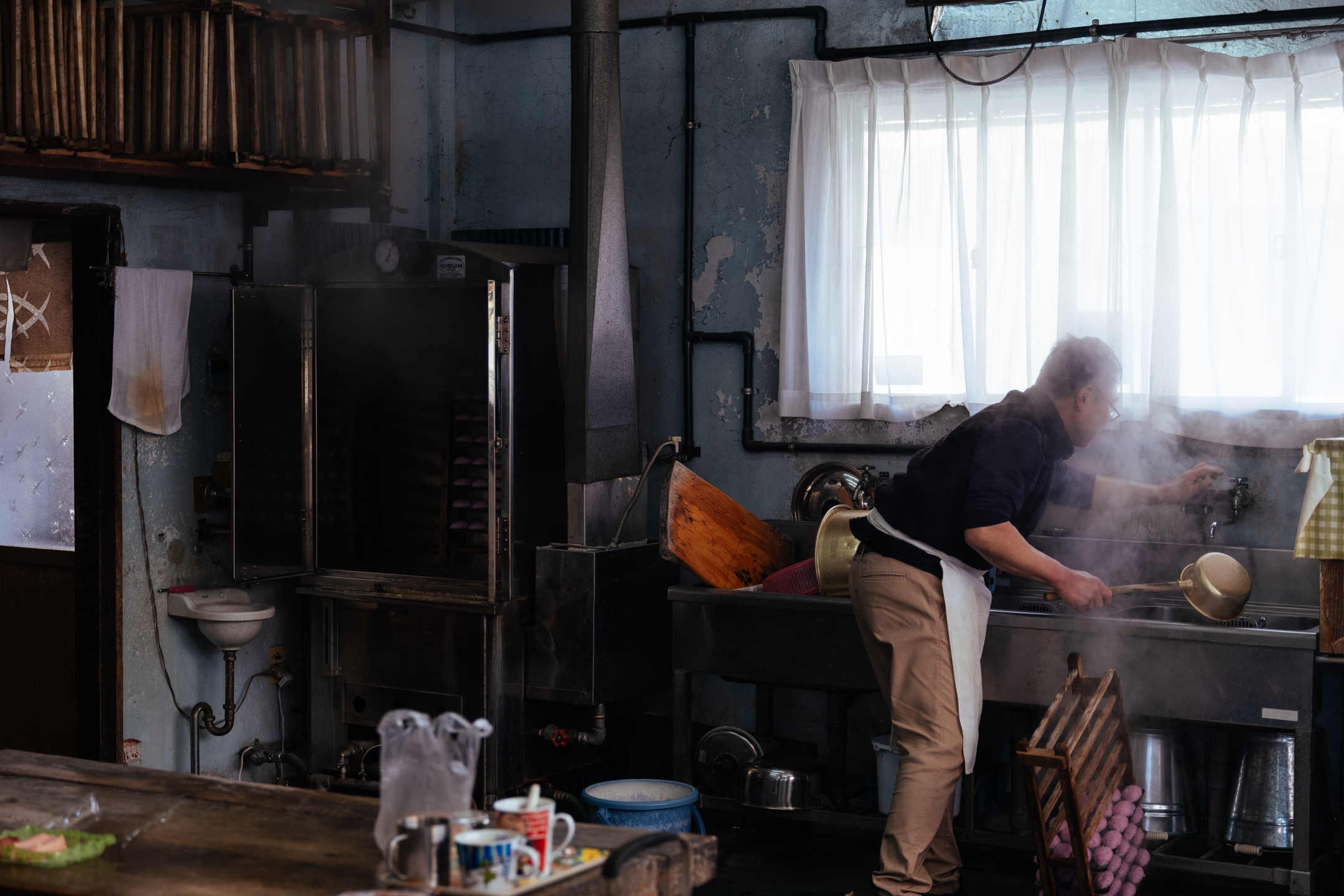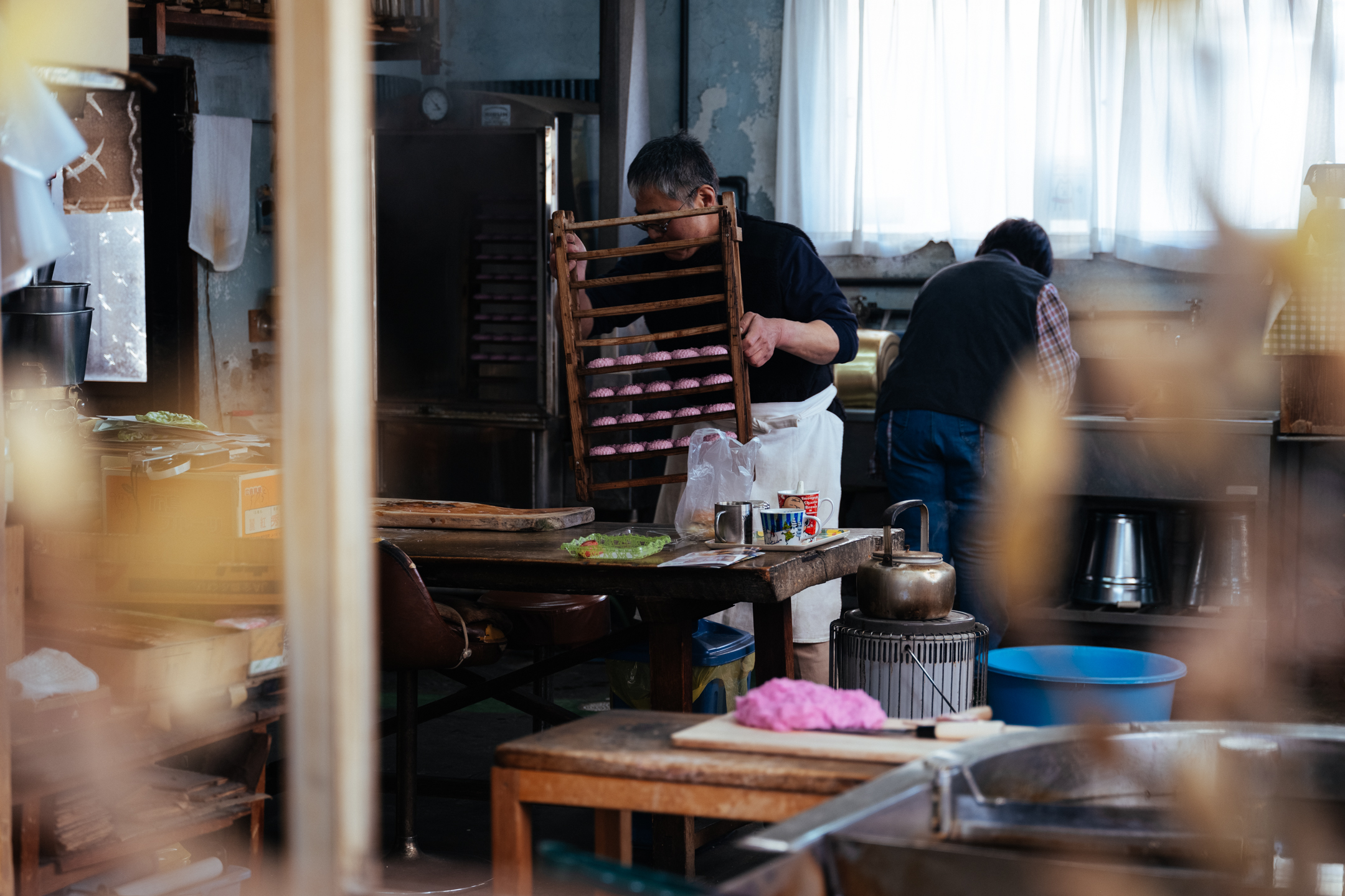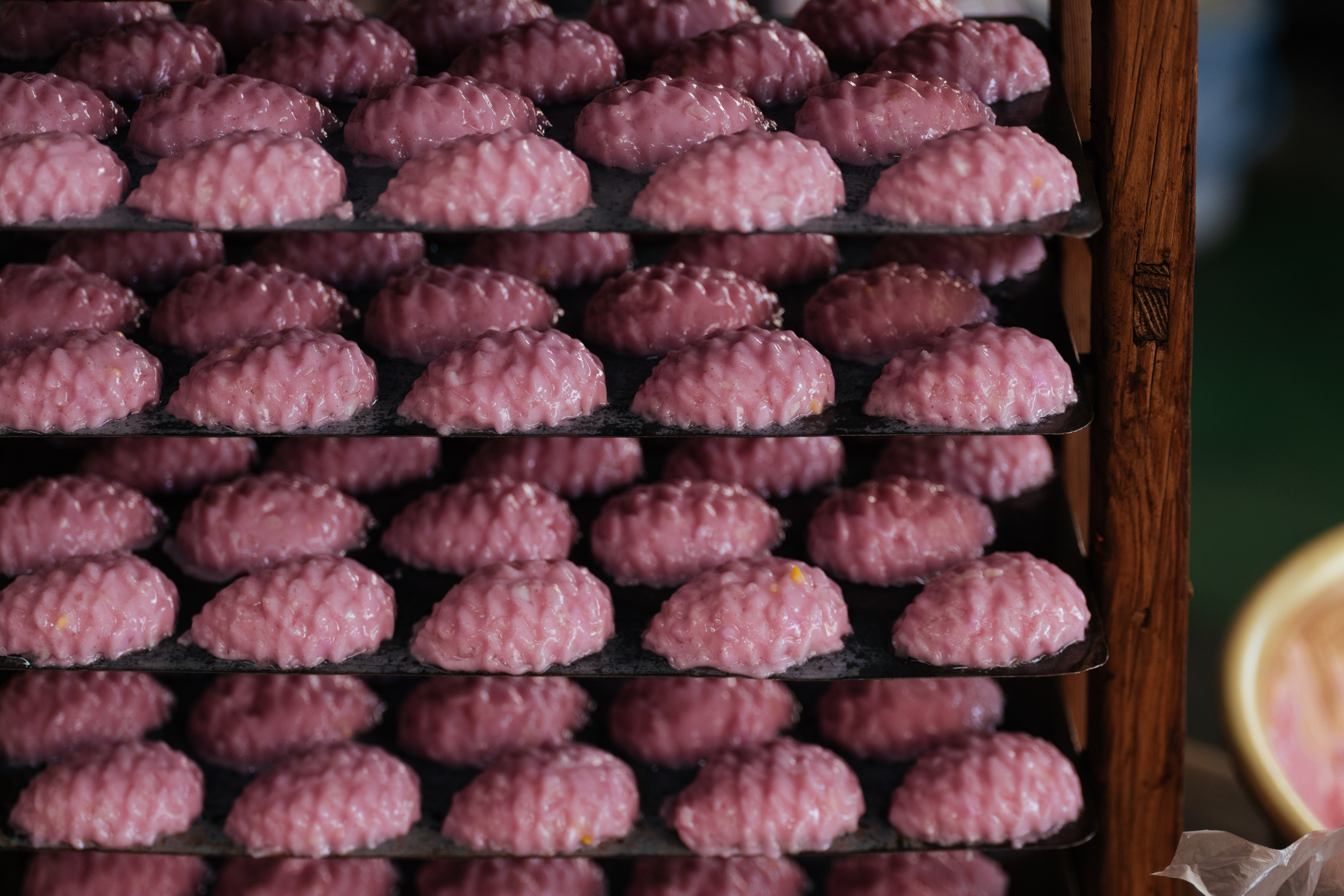 이날 만들고 있던 것은 ‘타마고텐(계란 튀김)’. 자른 삶은 계란을 선명한 분홍빛 어육 반죽으로 감쌉니다. 반죽을 펴는 마사츠구 씨의 솜씨가 무척 능숙합니다. 저울도 쓰지 않고 일정량을 도마에 펴서 계란을 감싸고 기름에 넣는 과정을 반복합니다. 몸이 기억하는 리듬에 맞춰 차례차례 튀겨냅니다. 기름 속에서 보글보글 춤추는 어묵은 아내인 요시미 씨가 적당한 때에 건져냅니다.