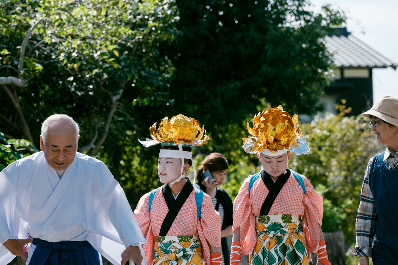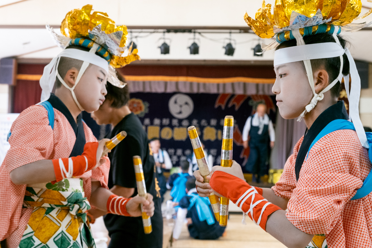 ‘후쿠다 사자춤’의 주역은 그해 만 12세가 되는 남아들입니다. 이 관습은 전염병이 유행했던 시기에 12세 어린이가 가장 많이 병에 걸렸던 것에서 유래하여, ‘병을 극복하고 건강하게 자라기를’이라는 바람도 담겨 있습니다. 원래 남아는 4명이었으나, 최근 저출산과 시대 변화에 따라 현재는 연령에 폭을 두어 소수로도 가능하게 되었습니다. 2024년에는 다이조 초등학교에 다니는 모리시타 요스케 군(6학년)과 텐마 미하루 군(5학년) 두 명이 주역을 맡게 되었습니다.