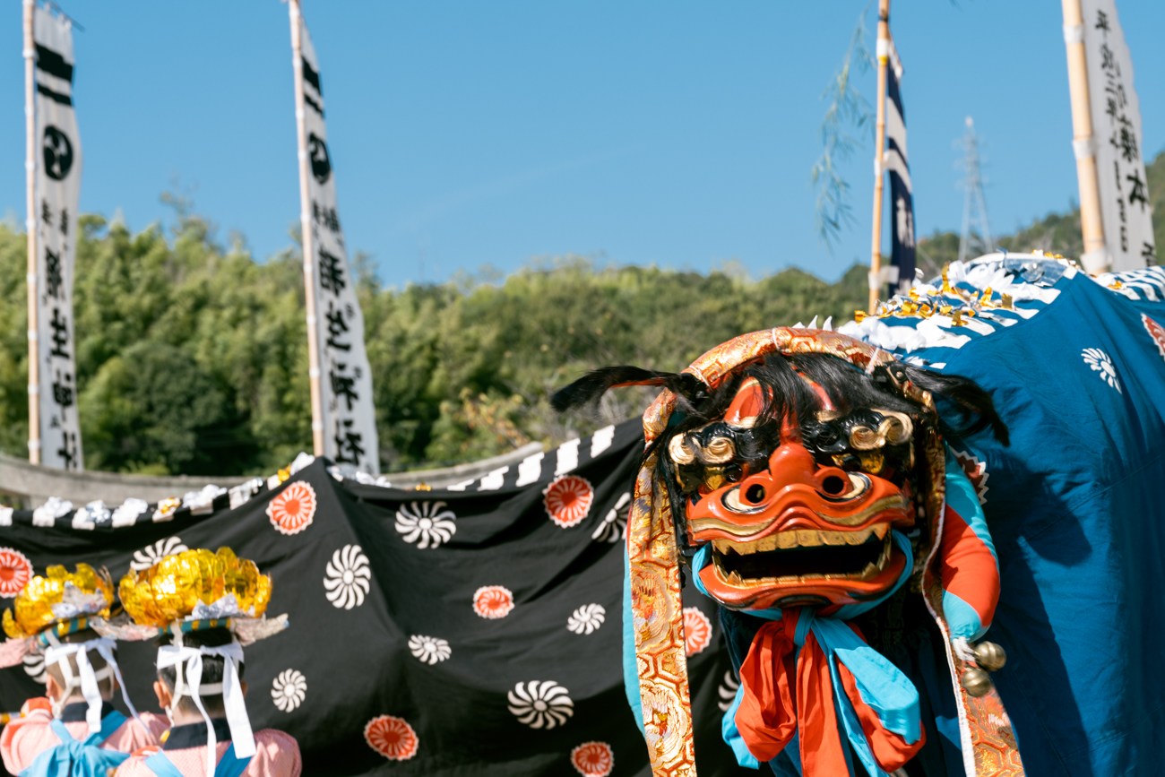 에도 시대에 시코쿠에서 전해진 것으로 알려진 이 사자춤은 300년 이상 지역에서 소중히 전승되어 왔습니다. 당시 천재지변과 전염병으로 고통받던 사람들이 사자춤을 봉납함으로써 오곡풍년과 마을의 번영을 기원한 것이 시작이라고 합니다. 1981년에는 히로시마현 무형민속문화재로 지정되었으며, 현재는 지역 유지들이 발족한 ‘후쿠다 사자춤 보존회’가 그 전통을 계승하고 있습니다.