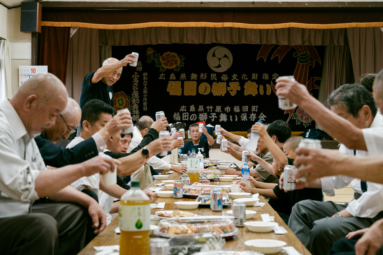 저녁부터는 ‘후쿠다 사자춤 보존회’와 축제 총대 분들이 모여 연회가 열렸습니다. 참가자들에게 연회도 축제의 일부입니다. “무사히 개최할 수 있어서 다행이다” “올해도 아이와 함께 참여할 수 있어서 좋았다”는 안도의 목소리가 여기저기서 들리며 성취감이 감돌았습니다.
