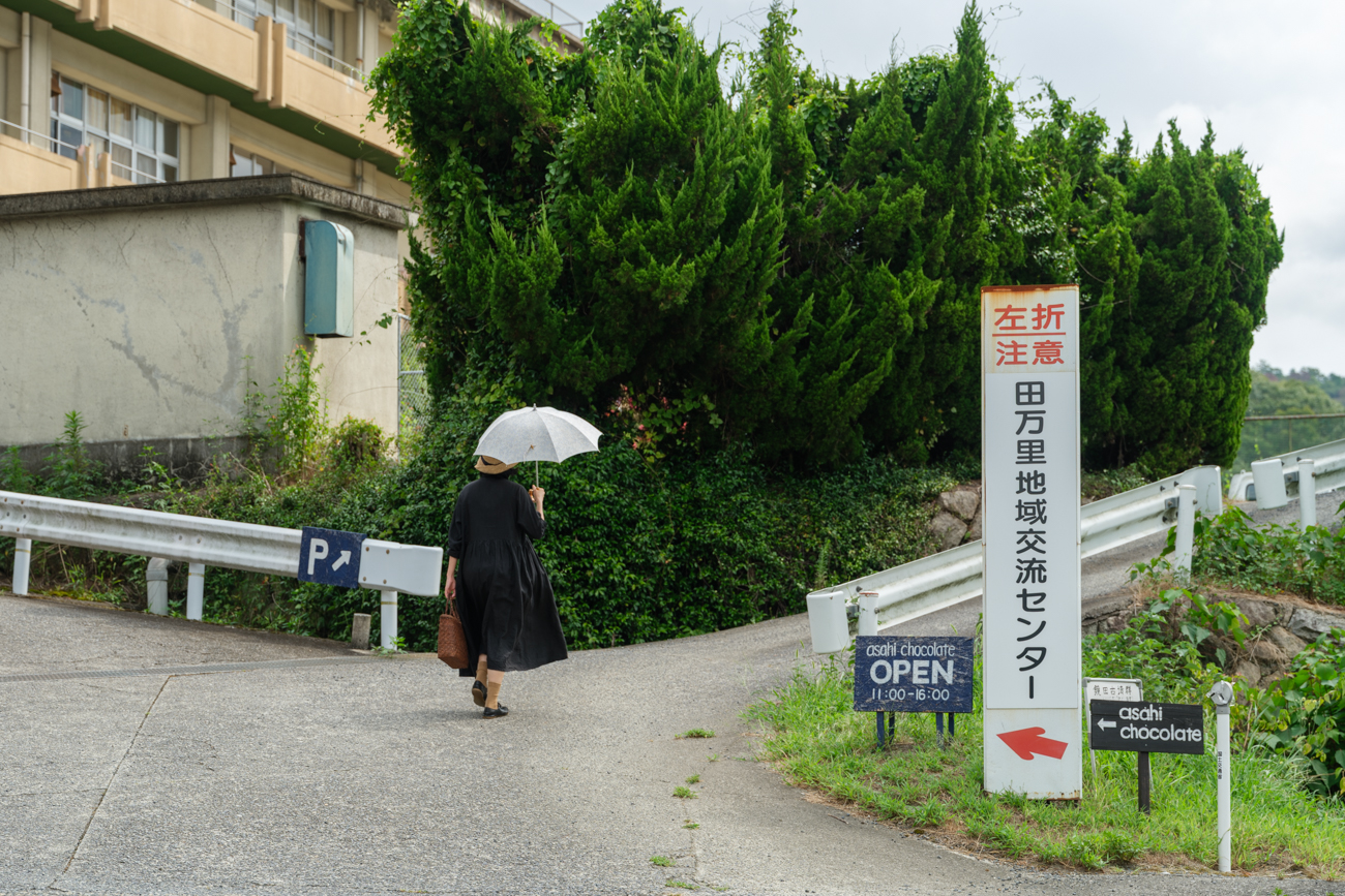 国道2号の田万里バイパス沿いに佇む、チョコレート専門店「あさひチョコレート工房」。カカオ豆から板チョコレートにするまで、自社内で作り上げる「Bean to Bar(ビーン・トゥ・バー)」という、クラフトチョコレートのスタイルを取り入れています。一見工房っぽく見えないのもそのはず。ここは、2005年に廃校となった旧田万里小学校。シンとした廊下や光が差し込む階段は、どこか懐かしい気持ちにさせてくれます。