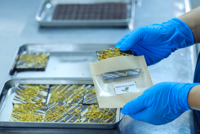 チョコレートを製造しているのは、福祉法人が運営する「多機能型事業所あさひ(以下、あさひ)」に所属する利用者と職員のみなさんです。平成30年7月の豪雨をきっかけに、災害に左右されずに続けられ、地域貢献にも繋がる仕事を検討する中で、ショコラティエが候補に上がりました。時同じくして、チョコレート博士こと、広島大学名誉教授の佐藤清隆氏がその思いに賛同。佐藤先生監修の元、道具の使い方やカカオ豆の扱い方などを熱心に学び、出会いから1年半の修行を経て、2022年にようやく板チョコが販売できるようになったそうです。