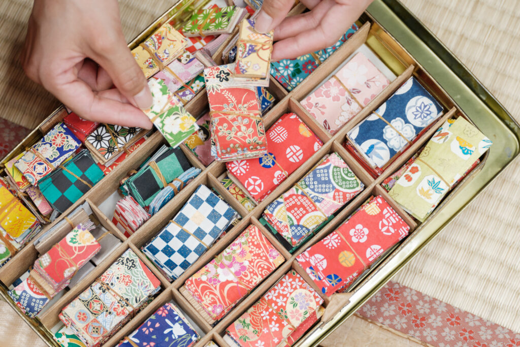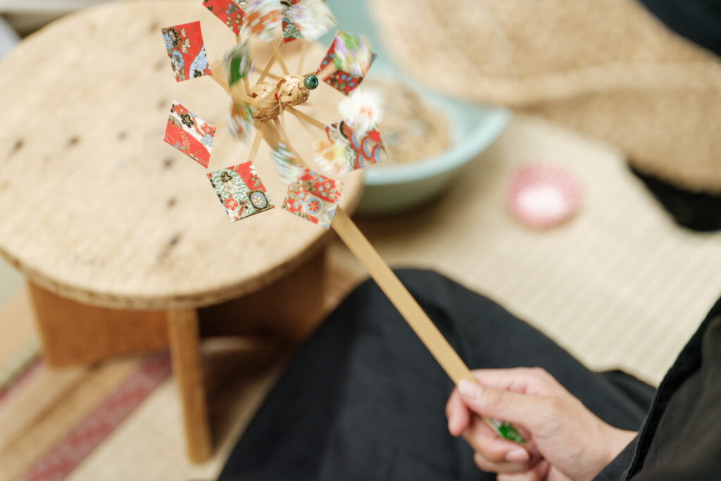 「まちなみ竹工房」で一番の人気は、小さな子どもから大人まで挑戦できる「風車づくり」です。風車は、竹を細く割って削り、風車用の長さに整えられた竹ひごを、専用の台の上で編んでつくります。竹ひごの編み方は、その人ごとのペースに合わせてマンツーマンで教えてもらえるので安心。竹ひご編みが難しい小さな子どもは、風車に着ける色とりどりの和紙を選んで貼り付けるだけでも、楽しい時間を過ごせます。完成した風車にフーッと息を吹きかけると、軽やかに回り、愛らしい。竹原を訪れた記念として、部屋に飾れるおすすめのお土産です。