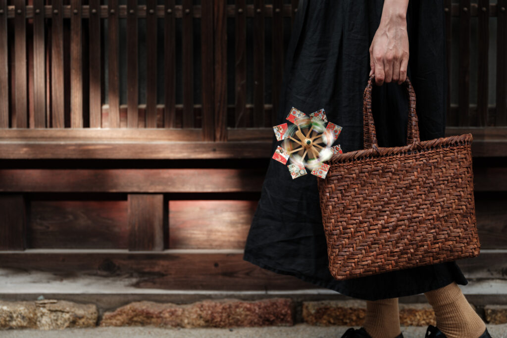 ここには、竹でつくられた籠やざるといった生活用品から、竹とんぼや風車のような昔ながらのおもちゃなどが棚いっぱいに並びます。空間の一角には畳があり、工房の職人数名がここで作品づくりをしながら、接客や竹細工体験を行なっています。小さな工房ながら、竹アイテムの幅広さに目を見張ります。