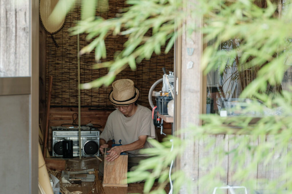 国道432号沿いにある竹製品の店「竹の駅」。この建物に隣接する一間で黙々と手を動かすのは、2017年に横浜から移住した寺本光希さんです。寺本さんは「竹の駅」の商品販売を手伝いながら、ここを拠点に竹工芸職人として制作に励んでいます。