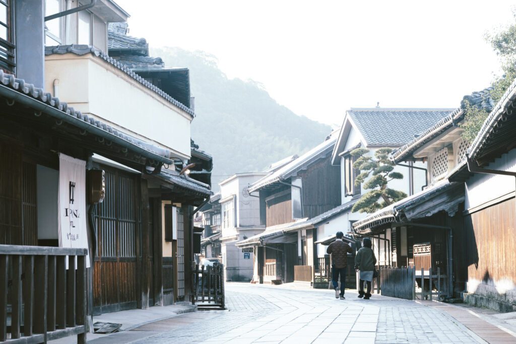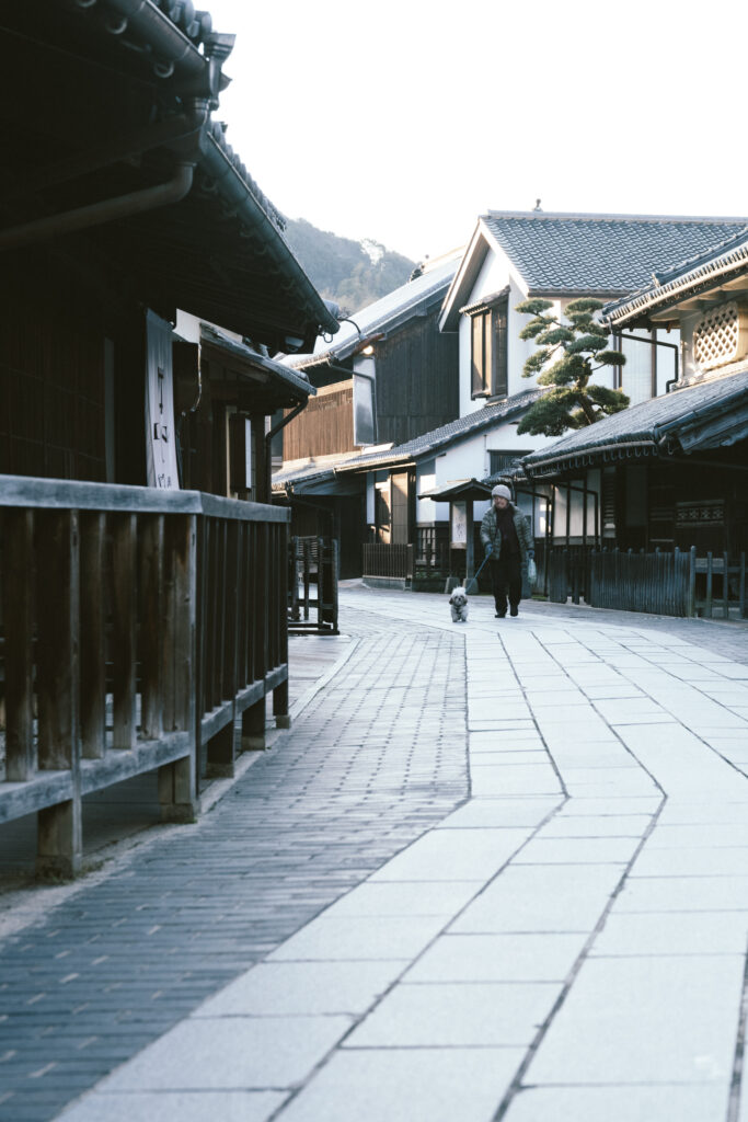 旅先で迎える朝は、この土地の暮らしを感じる特別なひととき。ひんやりと澄んだ空気が心地良い、静かな町並みを歩いてみましょう。普段は観光地として賑わいのある「たけはら町並み保存地区」ですが、今朝は早くから犬の散歩をしたり、自転車で移動したりする住民の姿が見られます。