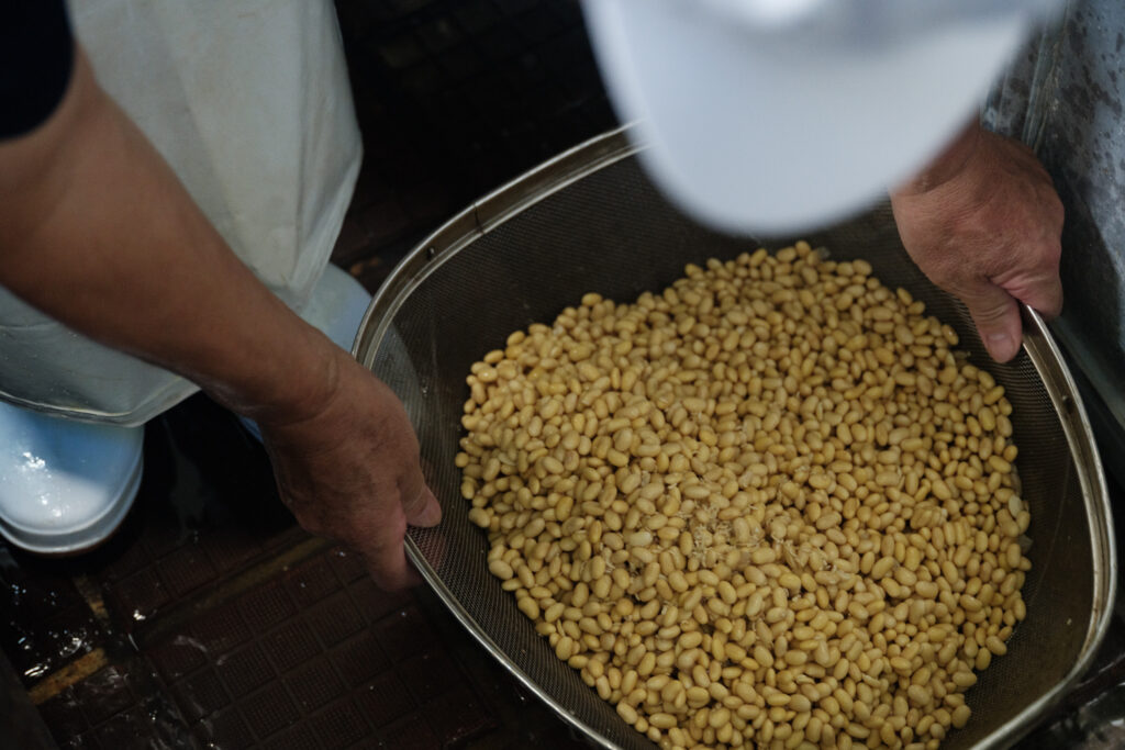 大豆から立ち上がる真っ白な湯気で、作業場は一気にやさしい香ばしさに包まれます。ここは、忠海で1939年創業の豆腐店。「おいだ食品」3代目の生田龍蔵さんは、この道約40年。深夜3時から作業を開始しますが、実は前日に大豆を水に浸すところから勝負は始まっています。季節によって変わる気温や湿度を見極め、その時々で最適な浸し時間を決める。そんな積み重ねが豊かな風味へと繋がります。