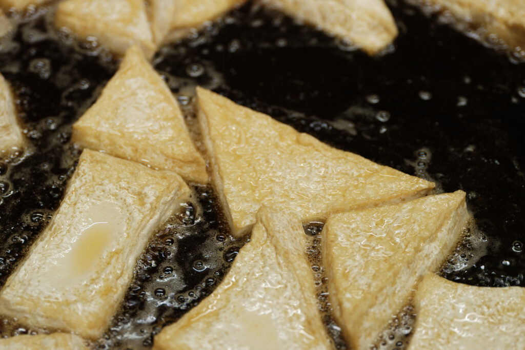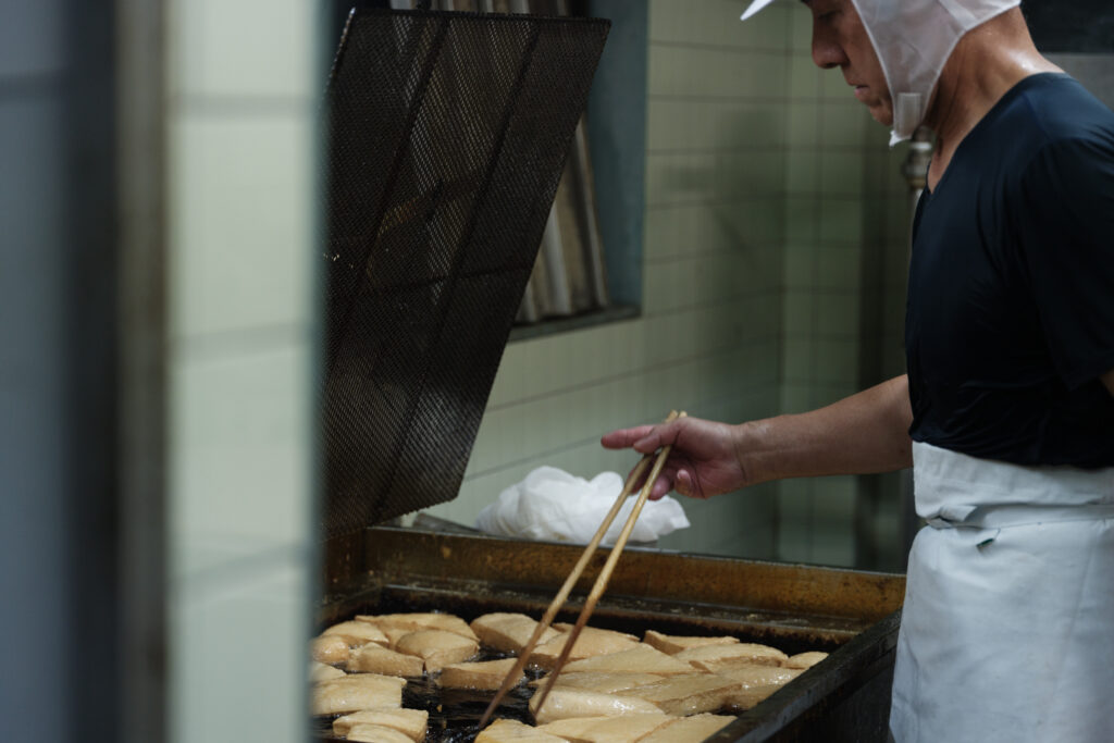 おいだ食品の豆腐の特徴は、時間をかけて行う丁寧な作業工程。ゆっくりと圧をかけて水分を抜くことで、ソフト豆腐も、箸でつまんでも崩れにくく、噛むほどに大豆の味わいが広がる豆腐に仕上がります。また、龍蔵さんの代では「揚げ」の厚みを一工夫。「揚げるにはこれがギリギリ」という極厚の「もと」を時間をかけて揚げることで、大豆の旨みたっぷり、食べ応え抜群の逸品に。厚揚げと間違えそうになるほどインパクトのある見た目に、思わず笑みがこぼれます。