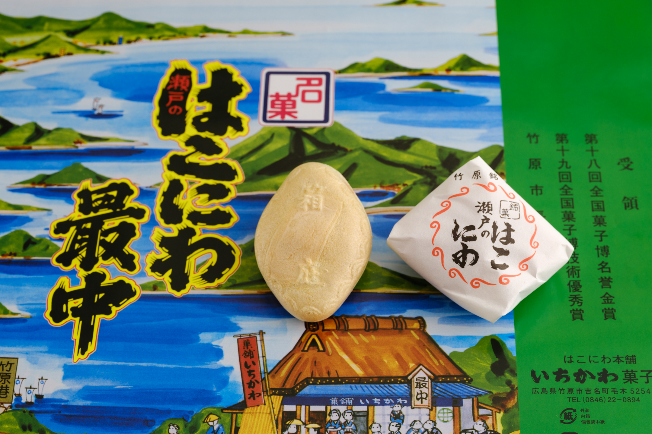 以帶著淡淡香氣的糯米製成的最中外皮,緊緊填入清爽的內餡。中央微微隆起的可愛造型與波浪紋樣,重現了瀨戶內海及其上漂浮的島嶼。這就是昭和 38 年創業的「いちかわ菓子舗」所代表的「はこにわ最中」。