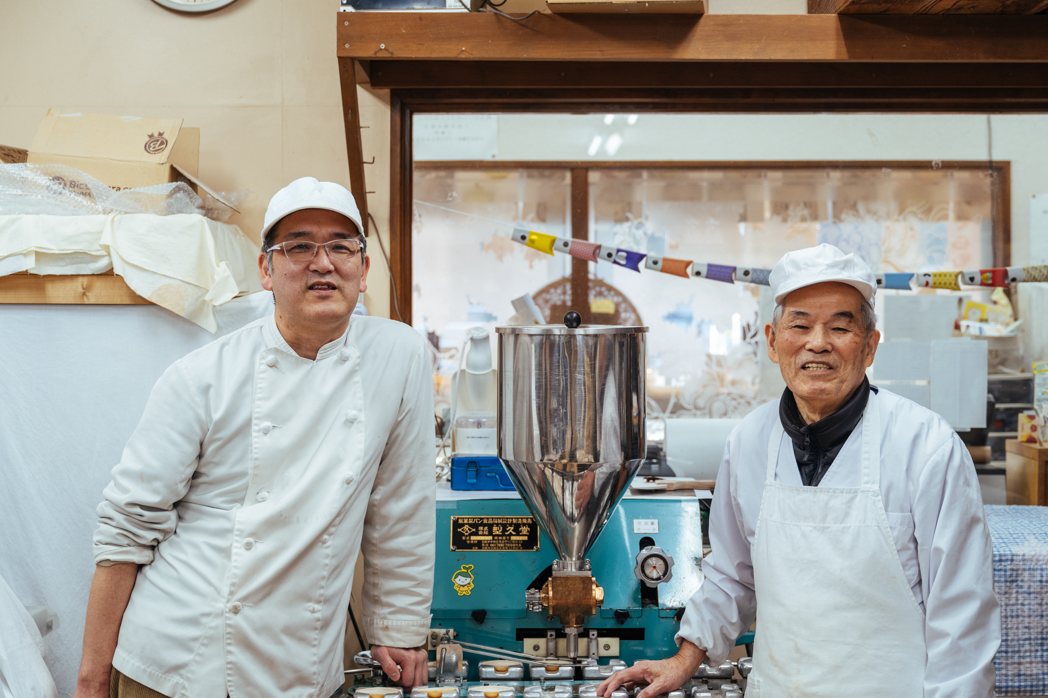 第一代店主市川重雄先生因為非常喜愛瀨戶內海,覺得這片美景宛如「箱庭」般而為其命名。從前一天開始備料、費時費工熬煮的內餡多達 35 kg,最後再以手工勤快包製;一天竟能做出 500 個,令人驚訝。如今他與兒子義隆先生並肩投入製菓,但那保留顆粒口感、拿捏絕妙的內餡收尾仍是「還不能交給你呢」——重雄先生以背影訴說著。其認真面對點心的態度,令人深切感受到店家長年深受喜愛的原因。