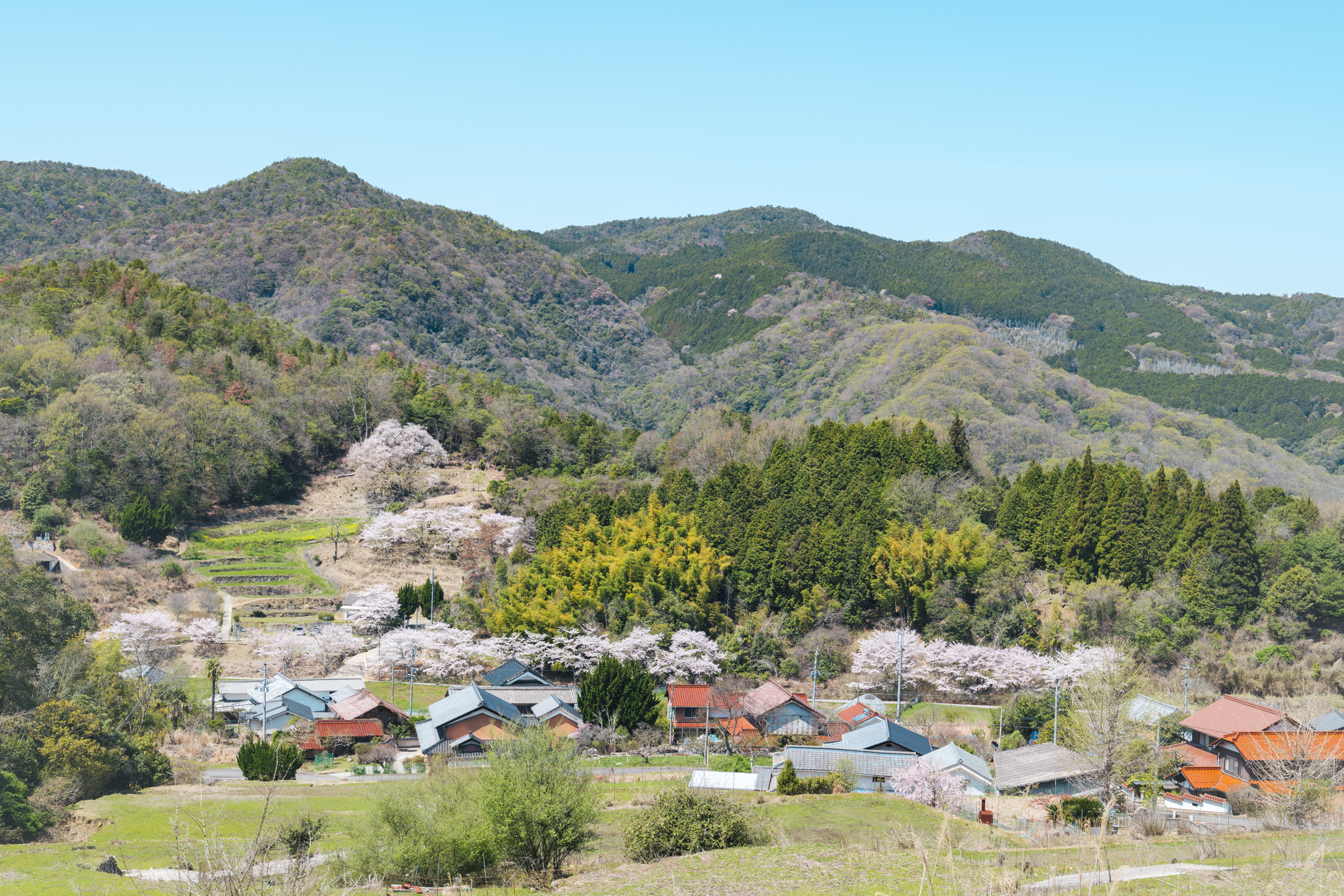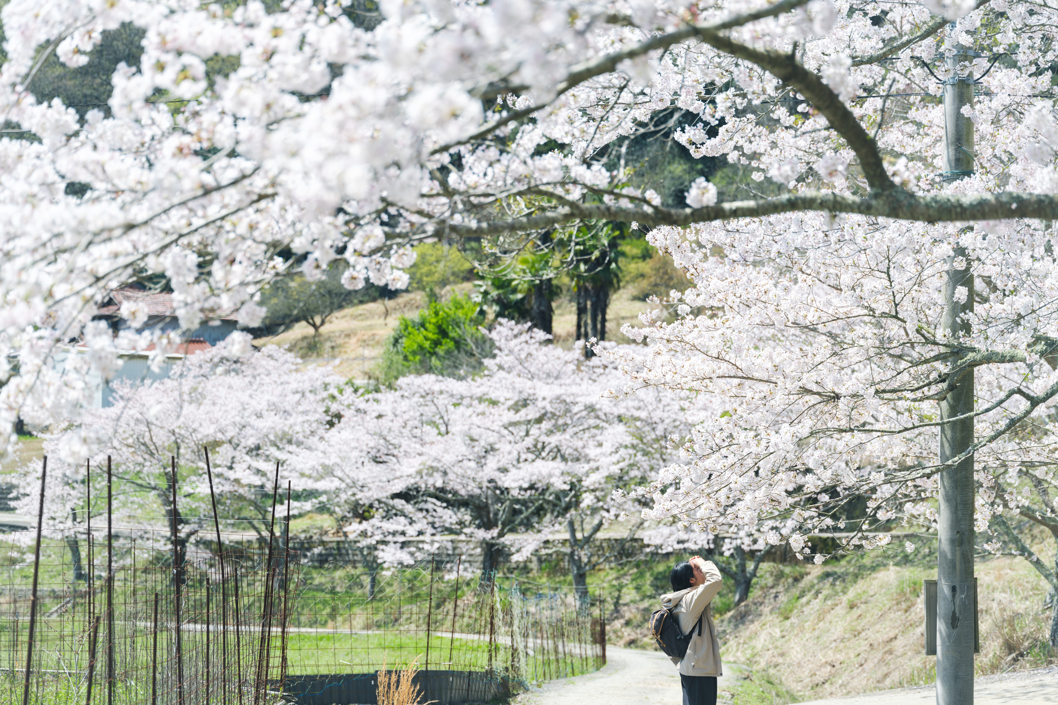 從國道 185 號線通往大櫻花樹的路徑,是足以讓初次造訪者感到不安的狹窄山路。但請放心,只要拿出勇氣行駛約 10 分鐘,便能抵達坐落於山間的美麗村落「宿根」。將車輛停放在曾為小學校址的社區集會所前運動場(現為停車場),抬頭仰望山坡,便能遇見那棵宛如守護著這個地區般、莊嚴聳立的壯麗大櫻花樹。這棵「大櫻」由當地居民組成的「宿根大櫻保存會」為中心,透過周邊除草、狀態診斷及環境整修等工作,細心地守護著。
