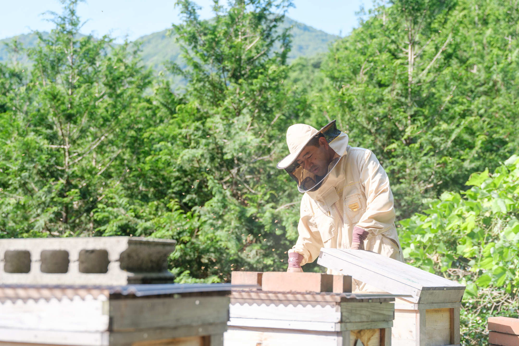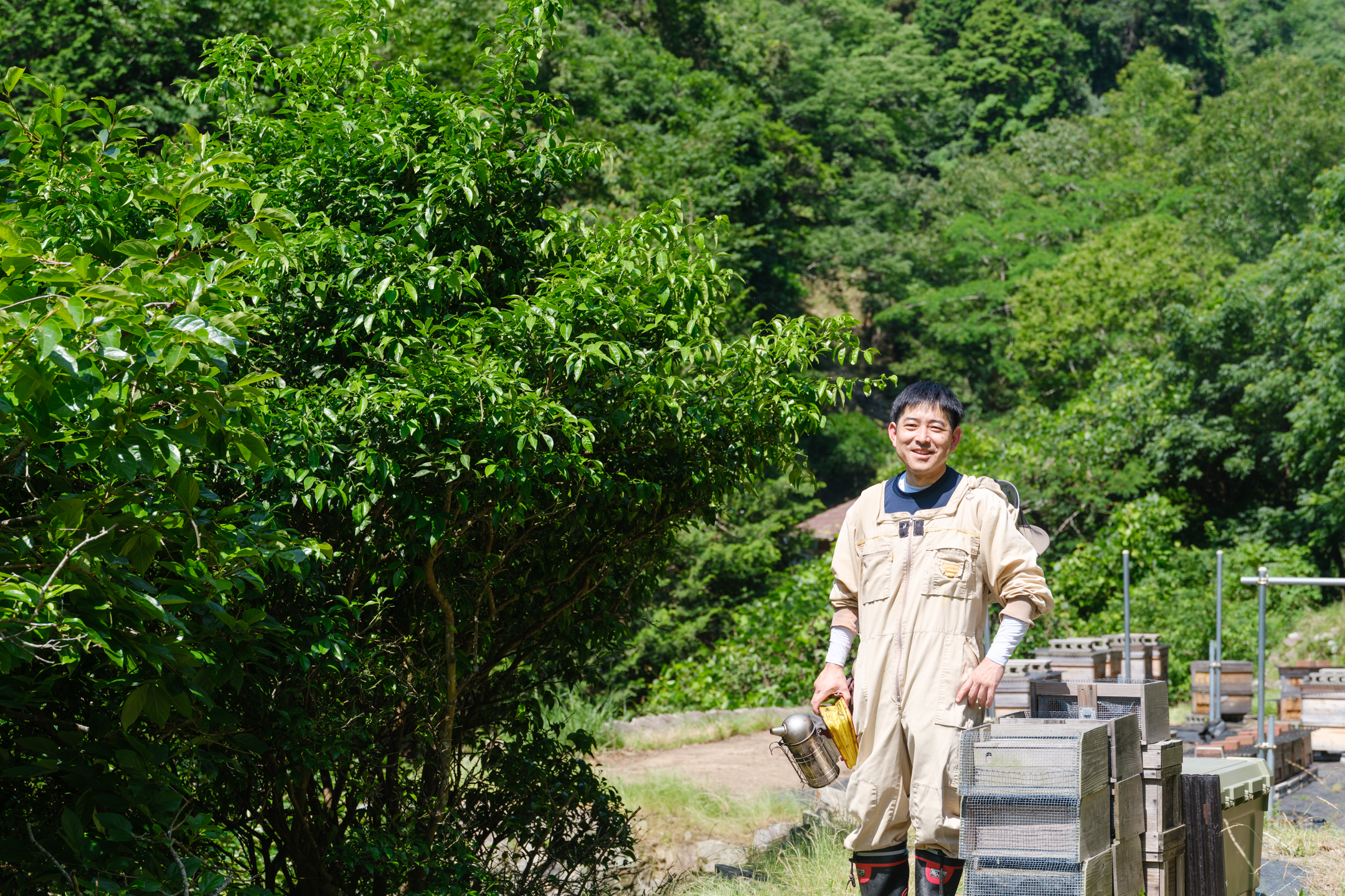 契機源自他擔任公司職員時,因興趣而常去的市民農園。有一天,他被前來授粉的蜜蜂身影吸引,並說那種吸引力強烈得不可思議。自此彷彿被命運引領般踏入養蜂世界,透過自學與累積經驗,兩年後便開始了自己的養蜂事業。