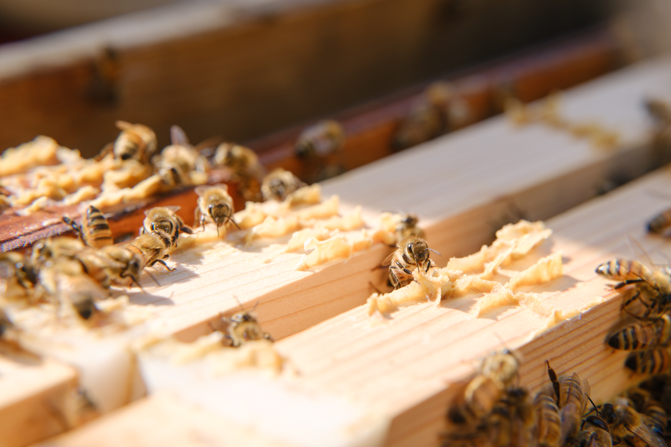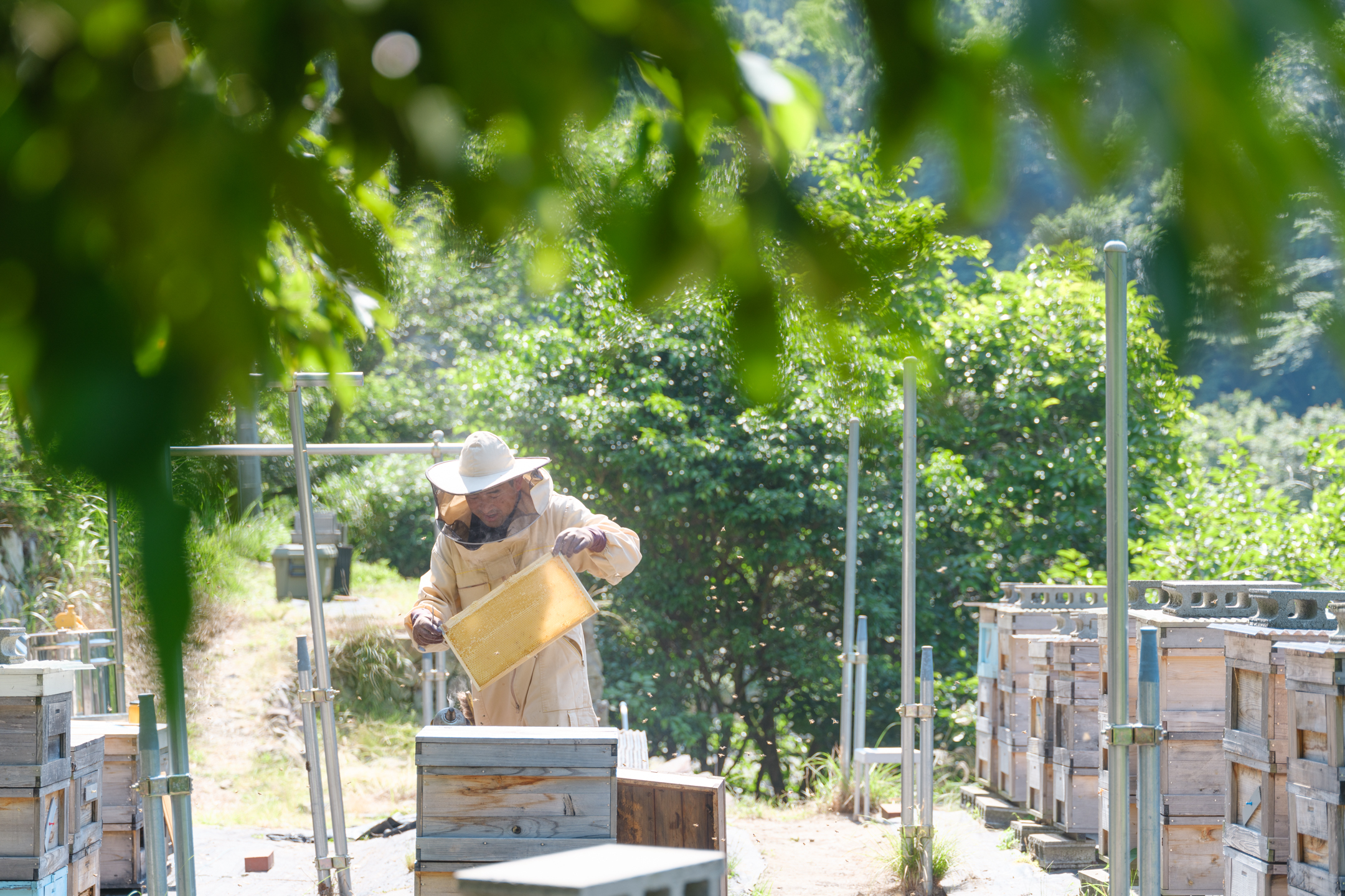 福島先生的堅持在於:不過度採蜜,並打造讓蜜蜂能無壓力生活的環境。一般養蜂在採蜜後有時會餵食糖水,但他說「那樣蜜蜂太可憐了」。此外,他選擇農藥使用量少、以釀酒米為主的稻田廣布之地,確保蜜蜂能安心飛舞的環境。如今不僅在竹原市內,也在瀨戶內的各座島嶼設置蜂箱,蜜蜂們在自然豐饒的地區中精神十足地活動著。